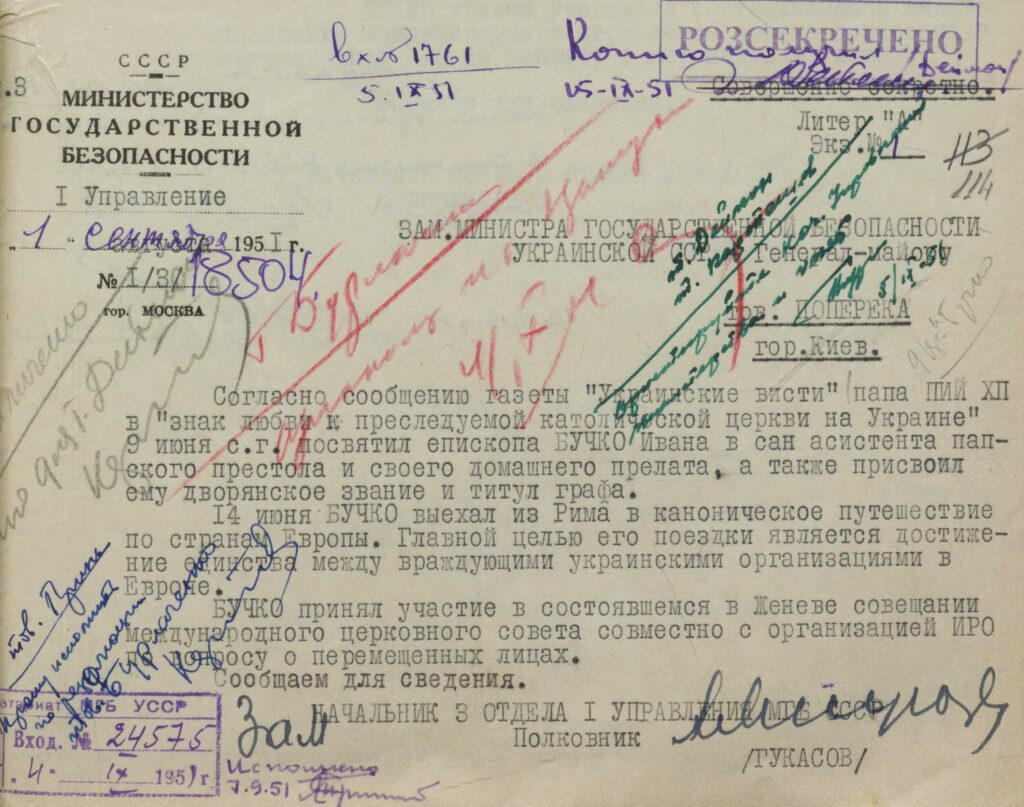 Зокрема, в архівних фондах розвідки виявлено й опрацьовано нові документи про оперативну розробку єпископів Івана Бучка і Теодора Ромжі. Серію розпочала вступна стаття, присвячена архієпископу Бучку.